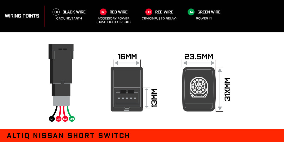 OEM Precision Fit: Specifically designed to fit Nissan models, the ALTIQ™ Short Push Button Switch offers a factory-like appearance and effortless installation for a seamless dashboard integration.