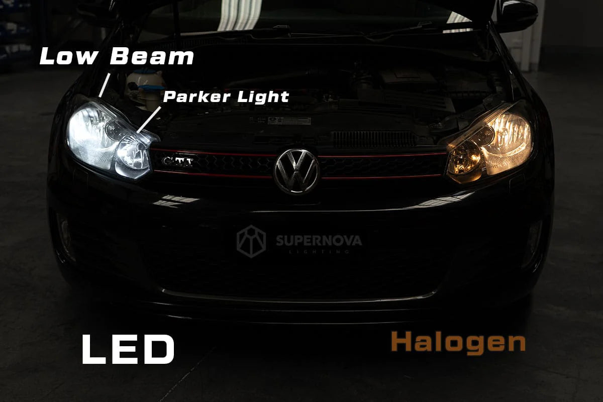 The Golf 6 & 7 deliver great features across the platform yet the headlights are one of the key areas which leave a lot to be desired, both in aesthetics and performance. Whilst the low beam globe is a common H7 socket size, upgrading to LED proves very troublesome as the factory headlight utilises a uniquely specific plastic globe adaptor which only fits halogen globes. Installing H7 LEDs traditionally would require a Golf specific LED adaptor and internal re wiring which was measured over hours. The adaptor would induce a varying amount of play where millimetres of movement can translate to unusable and glaring output patterns. Today we deliver a bespoke LED kit specific for Golf 6 and 7 reflector headlights. With a custom moulded adaptor base and contacts it’s a direct fit with install time measured in seconds or minutes (depending on engine bay clearance/rear headlight access of sub model Golf).